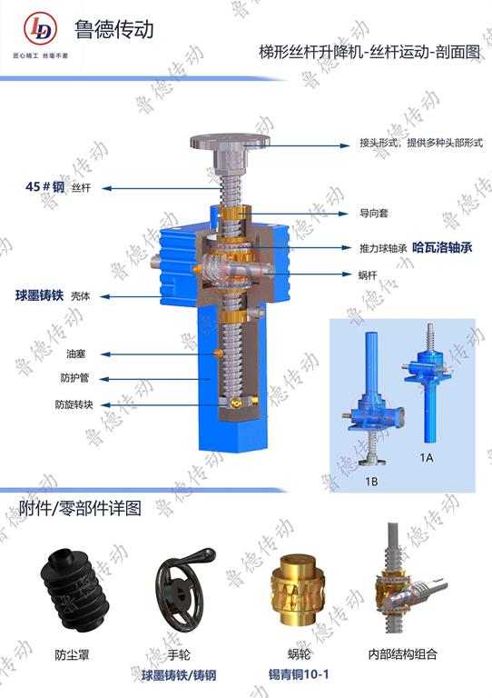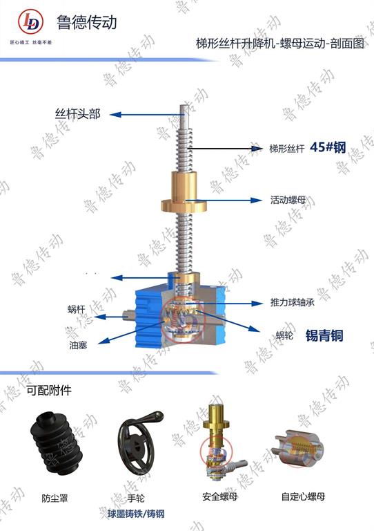 升降機絲桿和分為梯形絲桿/滾珠絲桿/不銹鋼絲桿,采用臺灣TBI和上銀的軋制工藝,達C7標準,不銹鋼絲桿采用304或316材質加工而成,耐磨耐腐,適用于食品、醫療等行業。蝸輪使用錫青銅10-1,銅材質采用離心澆鑄工藝,材質更耐磨。蝸桿使用45#鋼,阻力小,提高傳動效率。 蝸輪使用錫青銅10-1,銅材質采用離心澆鑄工藝,材質更耐磨。